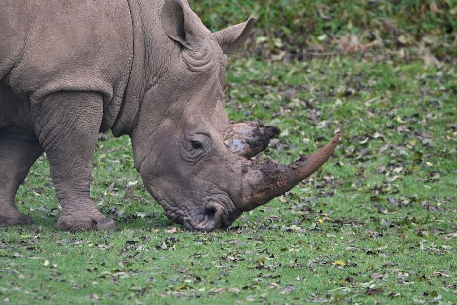 Their diet consists of approximately 1.5 to 2.5% of their body weight daily, requiring significant foraging time. Black rhinos are selective feeders, choosing nutrient-rich foliage. Access to sufficient food resources is crucial for their health and reproductive success, making habitat quality a key factor in their conservation; Water intake is also vital, especially during drier periods.
